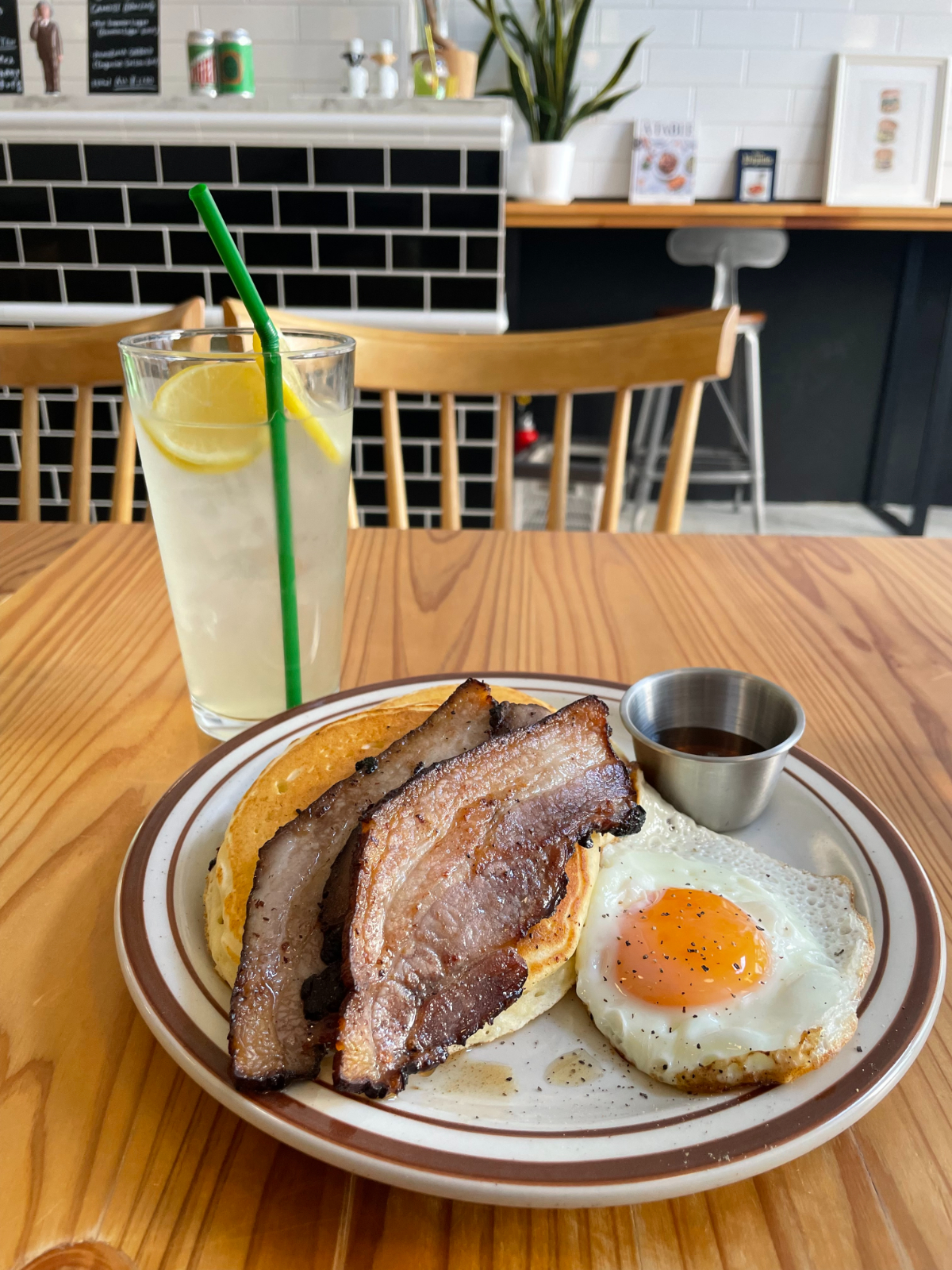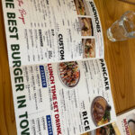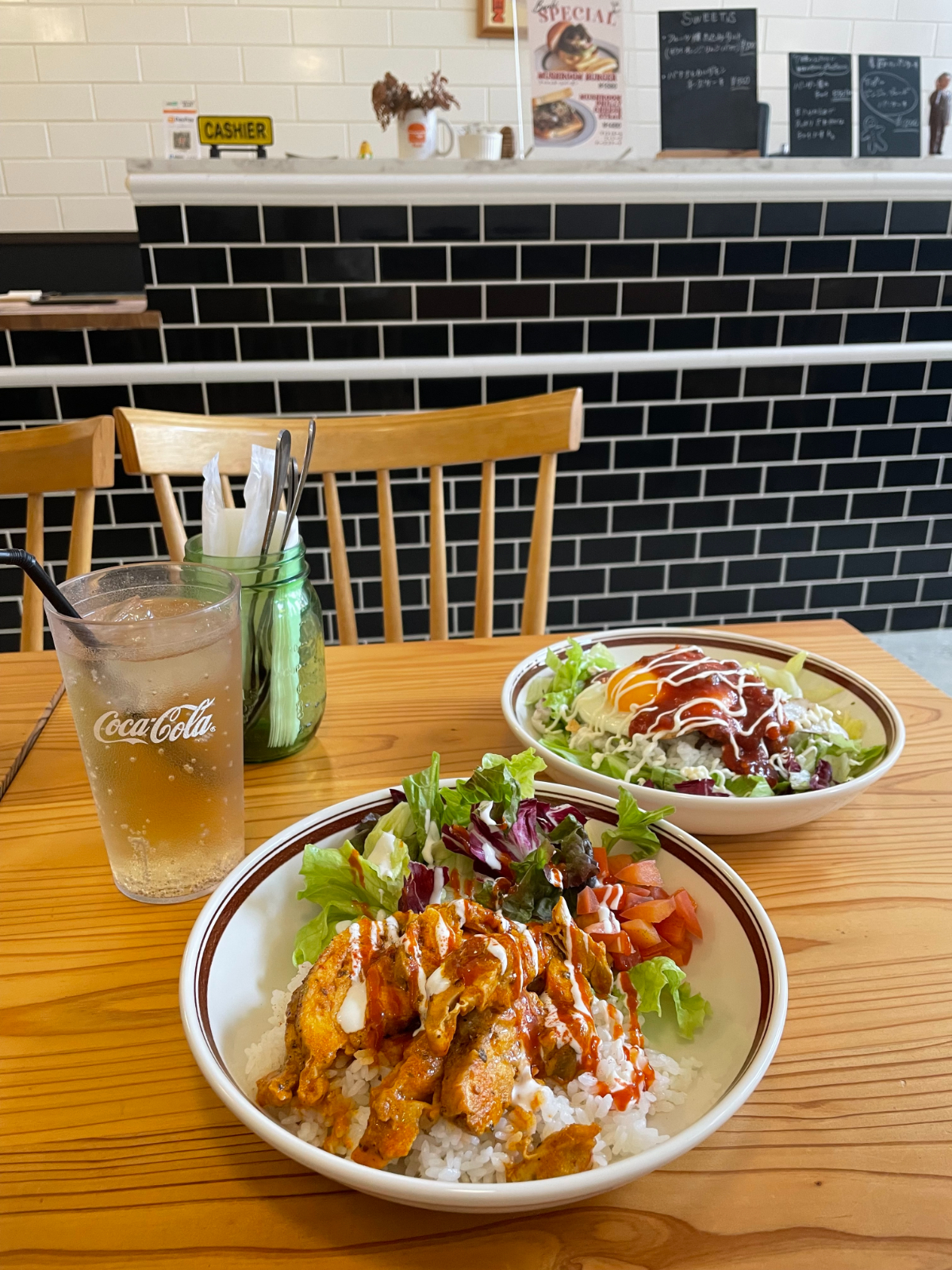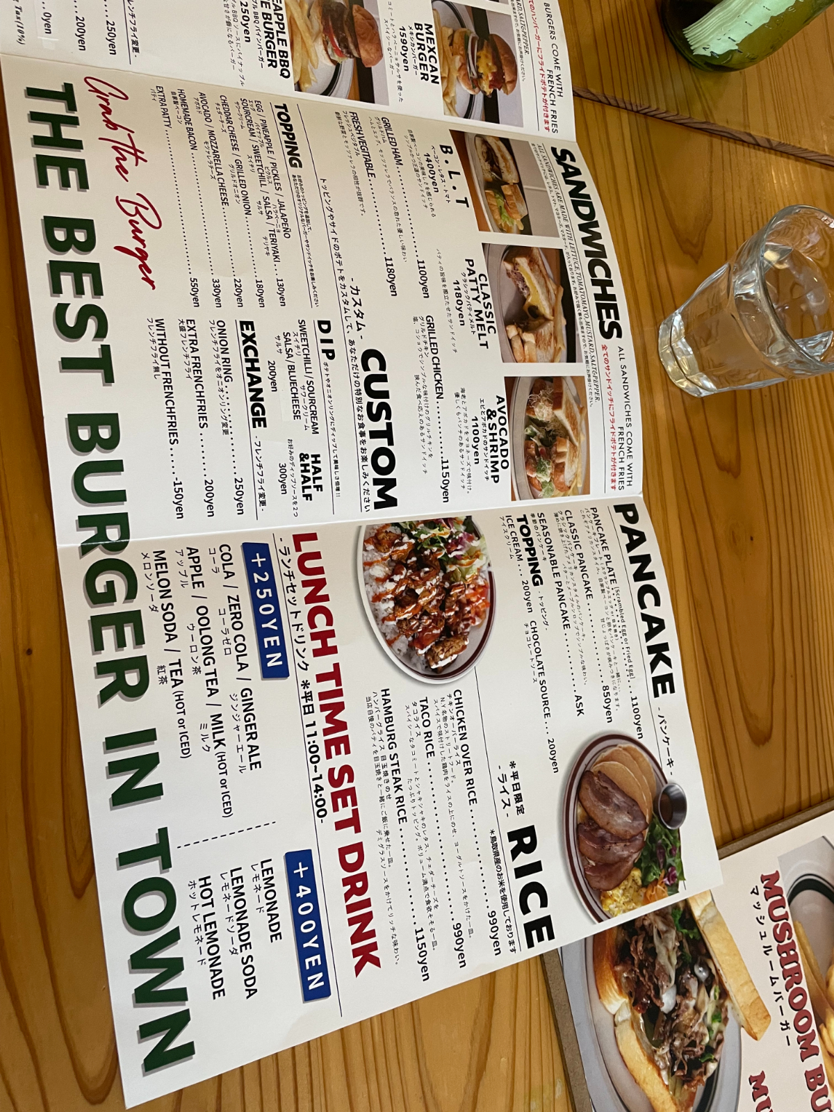 ハンバーガー、サンドイッチ、パンケーキ、スイーツがあり、最近では平日限定ライスも登場!