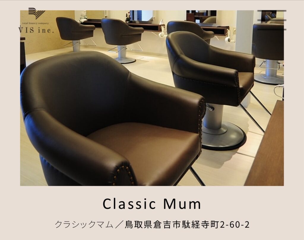 | 備 考 | 営業時間9:30~19:00 定休日 月曜日 駐車場 有 SNS Instagram【Classic Mum】 グループ内店舗初来店の際は技術メニュー10%off (特殊メニュー・着付けは除く) |